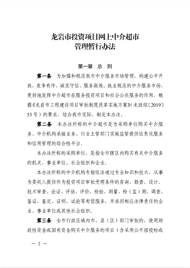 龍巖市人民政府辦公室關(guān)于印發(fā)龍巖市投資項(xiàng)目網(wǎng)上中介超市管理暫行辦法的通知(龍政辦[2019]111號)