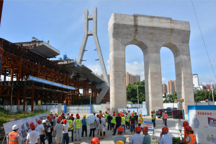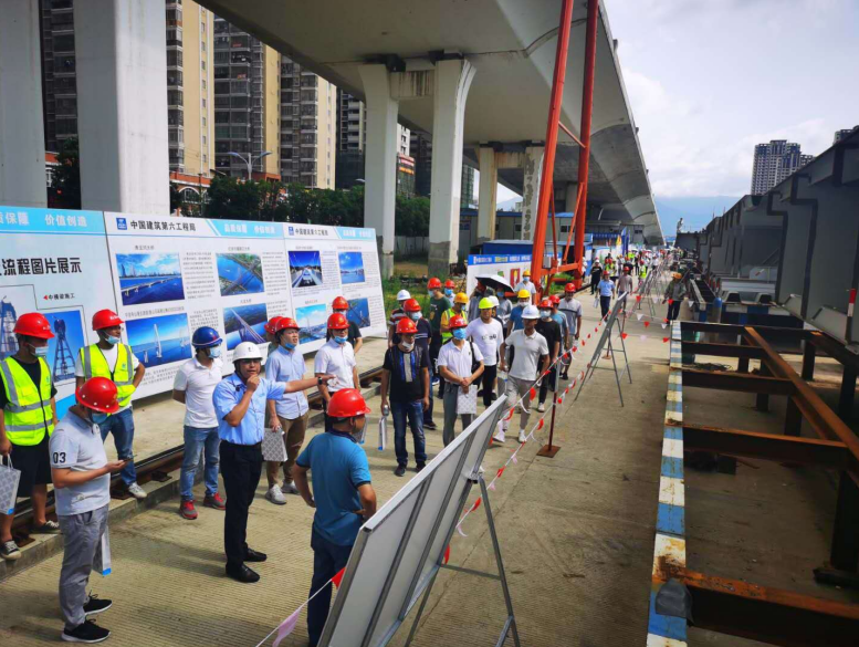 2020年6月28日,由龍巖城市發(fā)展集團有限公司主辦,龍巖市政建設集團有限公司(市城投公司)承辦,北京鐵研建設監(jiān)理有限公司、中國建筑第六工程局有限公司、中冶(上海)鋼結構科技有限公司協(xié)辦的龍巖大道高架橋項目質(zhì)量安全標準化觀摩會在龍巖大道高架橋主橋鋼箱梁工程現(xiàn)場舉行。觀摩會分拼裝區(qū)域、提升站區(qū)域、頂推滑移區(qū)域、步履滑移區(qū)域及主橋轉(zhuǎn)體區(qū)域分別展示了龍巖大橋主橋鋼結構拼裝、提升、弧形頂推滑移、步履滑移等新工藝及主塔“水平二次轉(zhuǎn)體”、鋼箱梁頂推、斜拉索施工技術。