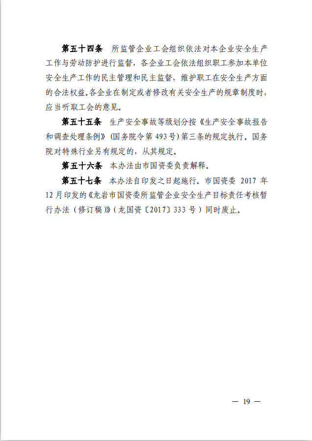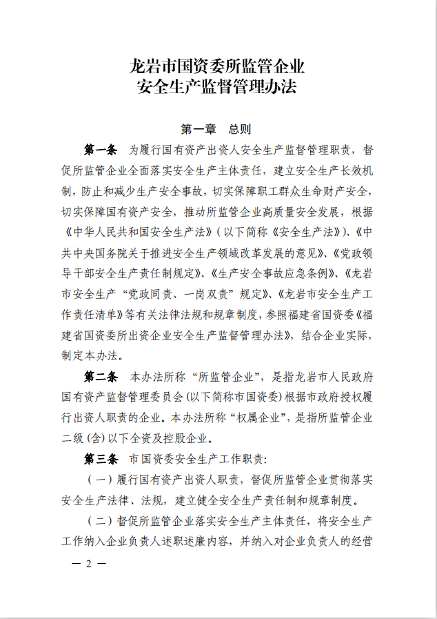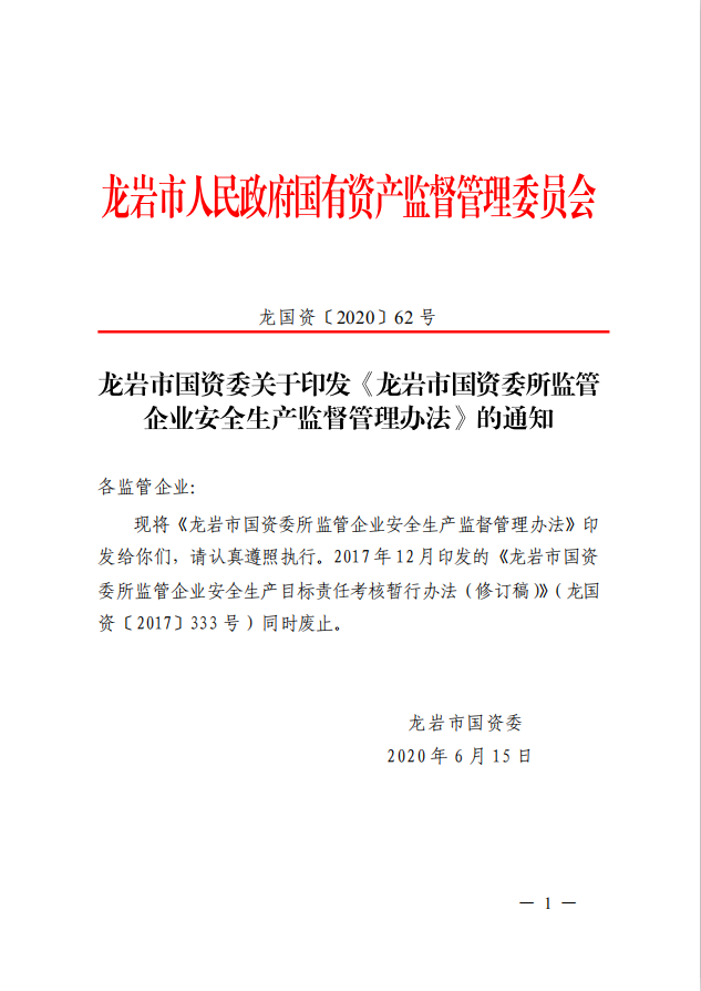 龍巖市國資委關于印發(fā)《龍巖市國資委所監(jiān)管企業(yè)安全生產監(jiān)督管理辦法》的通知(龍國資[2020]62號)